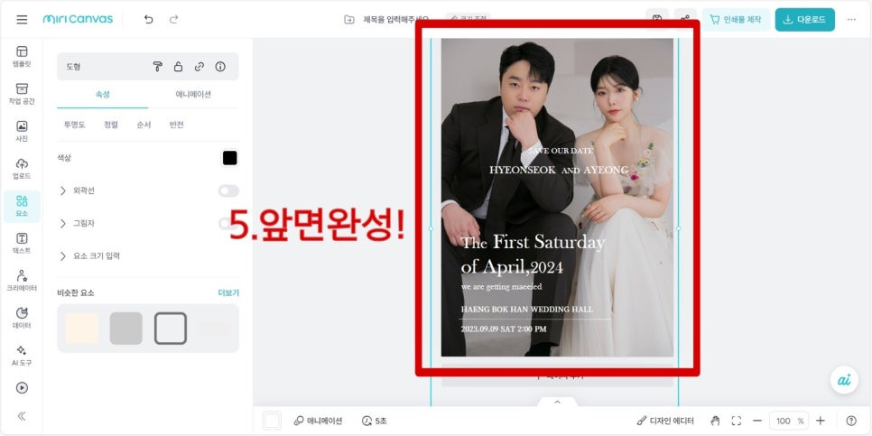 ◼ 직접 만들다 보니 내가 실수한 부분이 없는 지 꼼꼼히 체크해줍니다. 인쇄 후에 틀린 부분이 있다면 재인쇄를 해야 하기 때문에 인쇄비와 시간을 날리게 되니, 꼭 이름, 날짜, 장소 등 틀린 부분이 없는지 반드시 2-3번씩 여러번 체크 해줍니다. 눈을 동그랗게 뜨고 쳐다봐도 이제 틀린 부분이 없다 하시면 다음단계로 넘어갑니다.